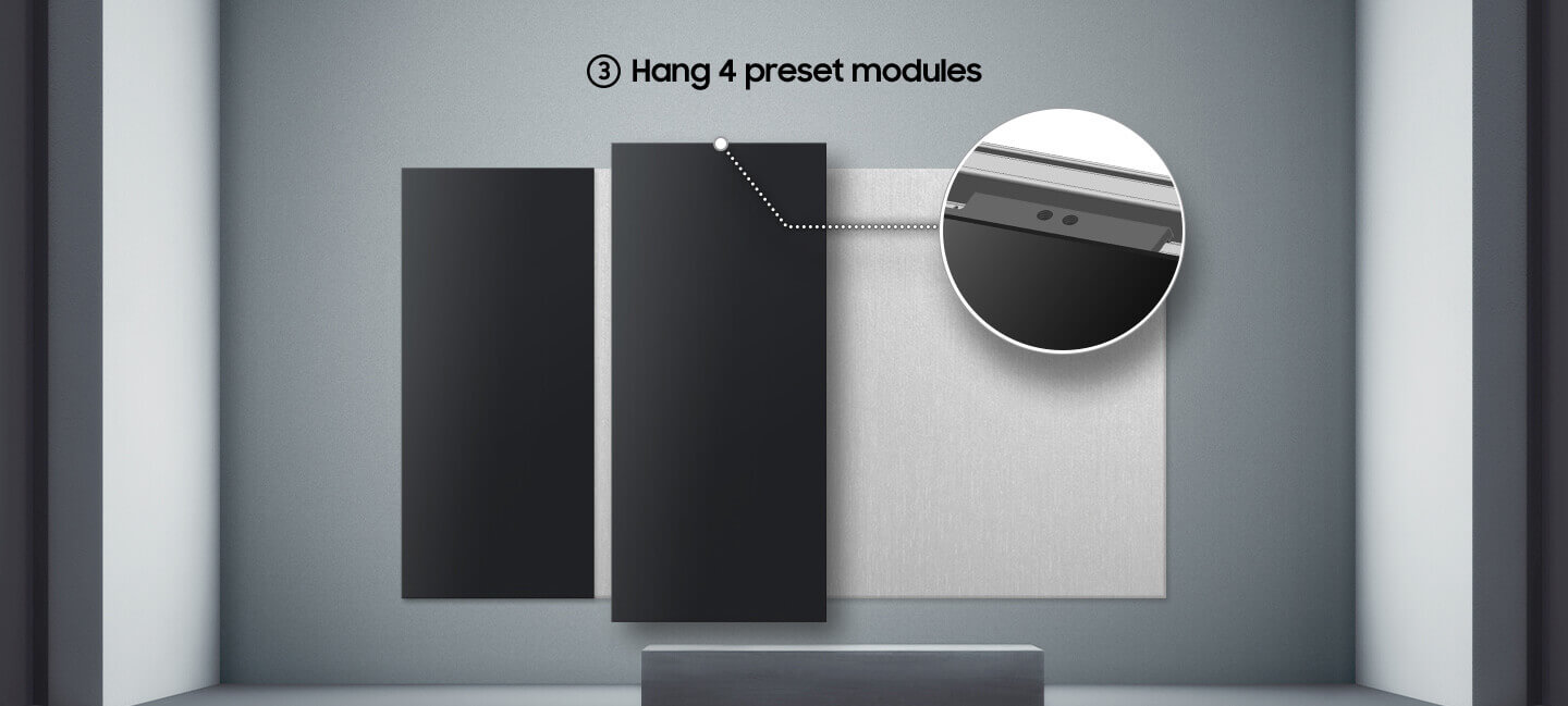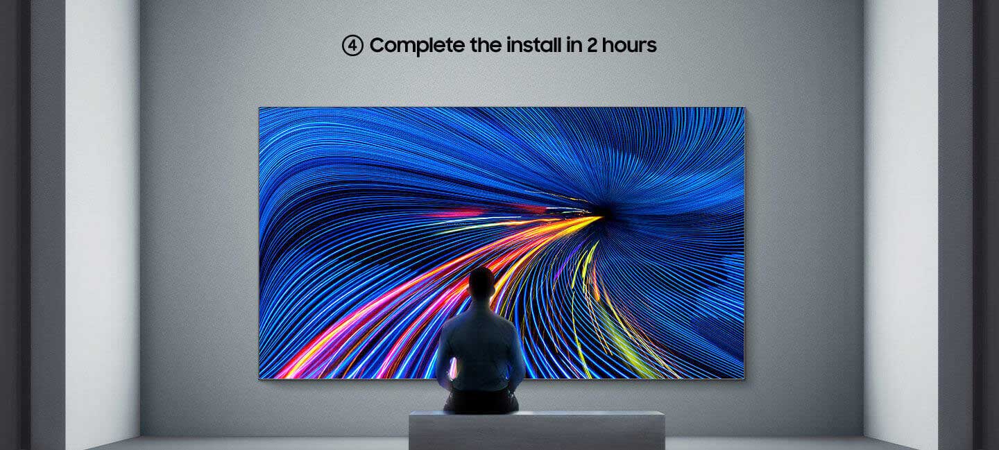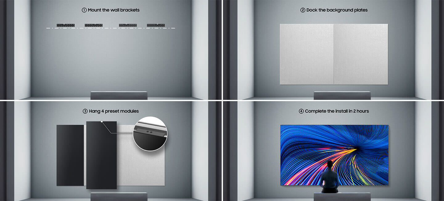 Samsung’s Quick Build technology makes installation a breeze. It only takes about two hours1 for two people to install a large all-in-one LED display. For this purpose, the background plates are docked and, depending on the size of the display2. three or four preset modules are hung up.