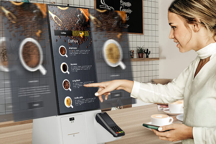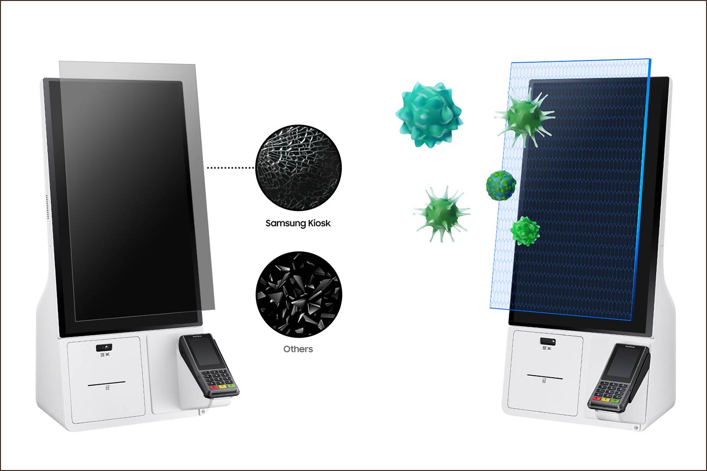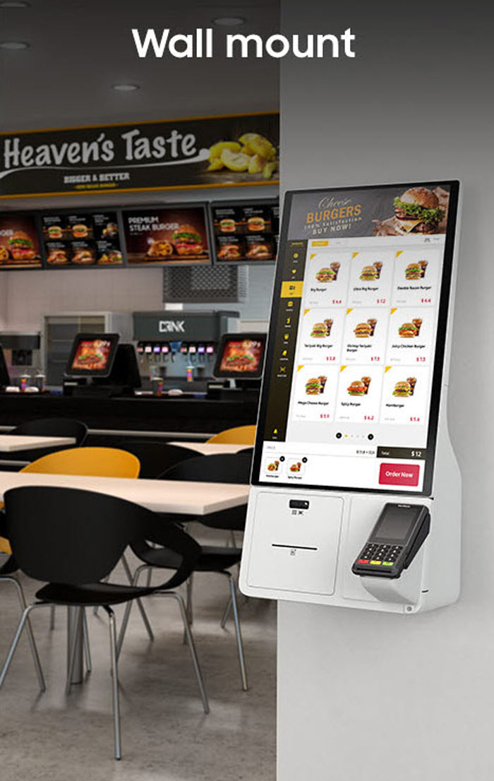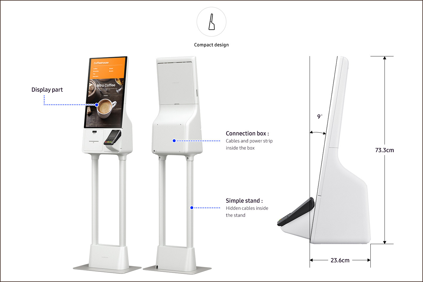 Add a stylish pop to existing environments no matter the backdrop Samsung Kiosk’s compact size looks great on its own, or with its neutral grey-white tones, blends naturally in any store.